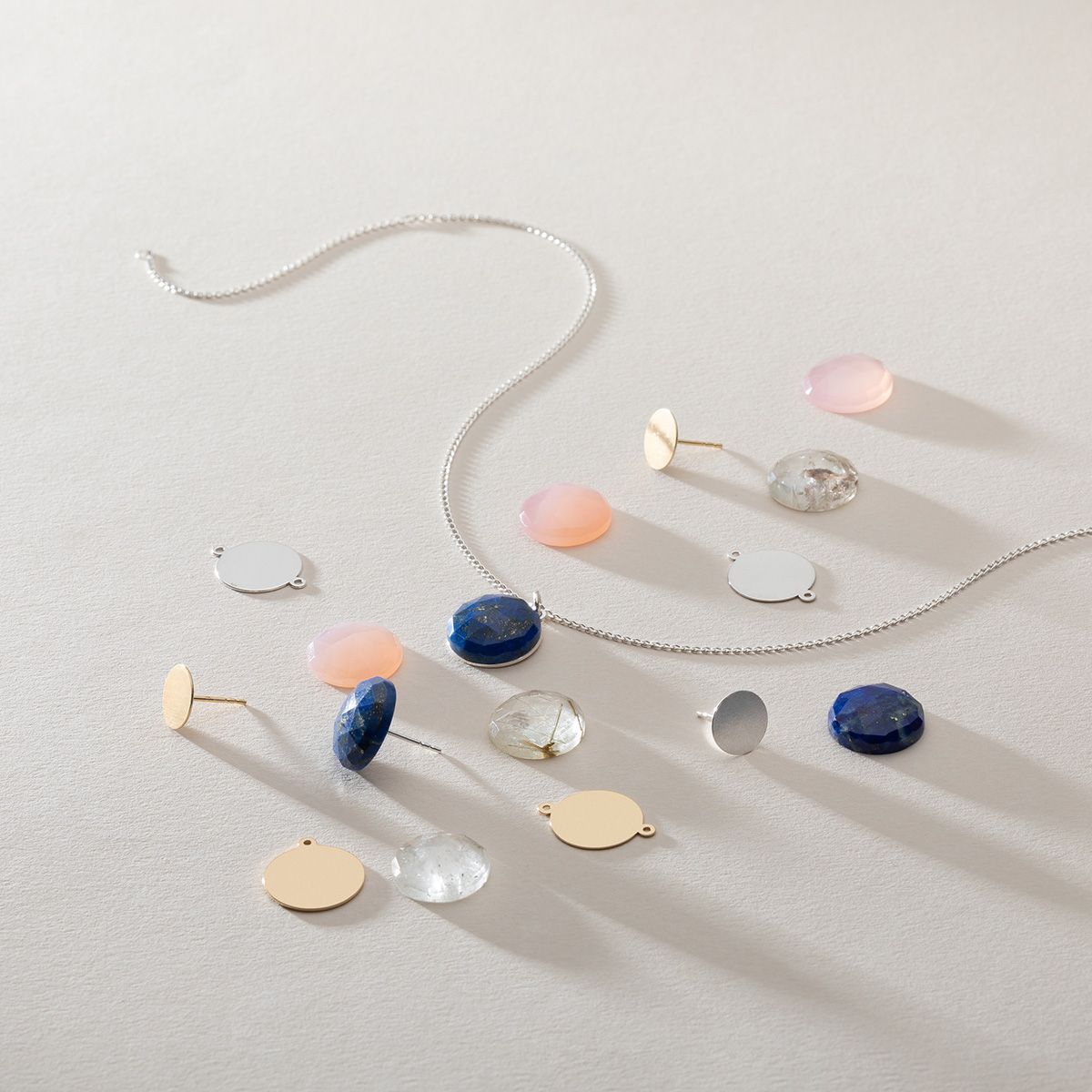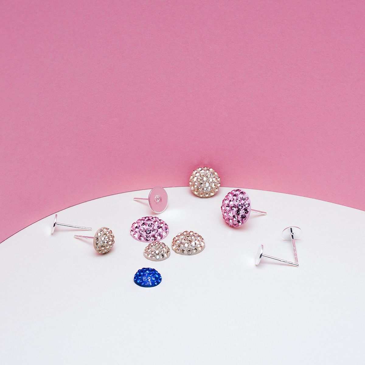 Zusätzlich können die Basen der Ohrstecker vergoldet, rhodiniert oder plattiert werden, wodurch sie farblich an die anzuklebenden Elemente angepasst und vor Oxidation oder Verfärbungen geschützt werden.