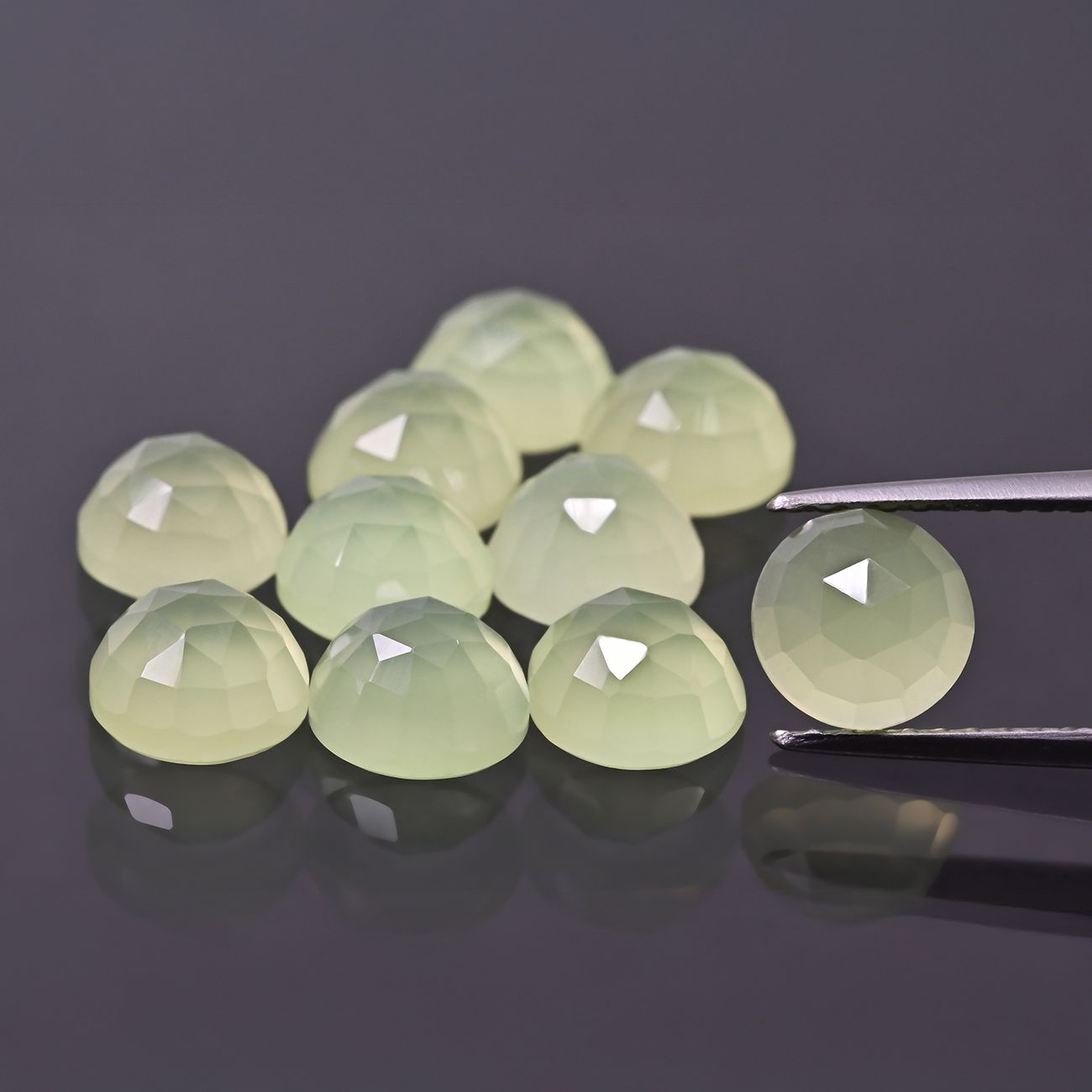 Celadon-Achat im Rosenschliff mit 6 mm Größe. Natürlicher Stein mit zartem grünlichem Ton, facettiert und flach unten. Ideal für frischen, leichten Schmuck.