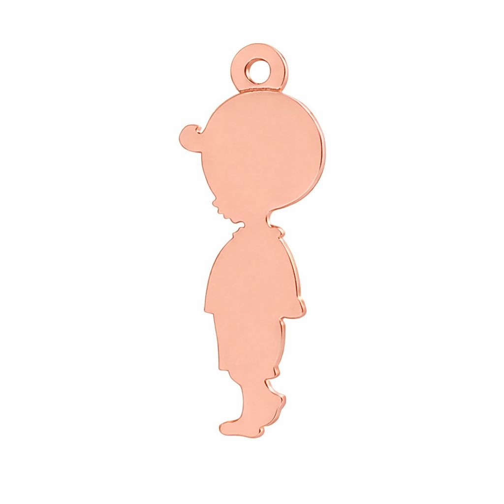 Anhänger Junge ist ein dekoratives Schmuckelement in Form einer Kindersilhouette. Gefertigt aus Messing, besitzt er eine glatte Oberfläche und eine kleine Öse zur einfachen Befestigung an Ketten oder Armbändern. Ideal für symbolischen oder persönlichen Schmuck.